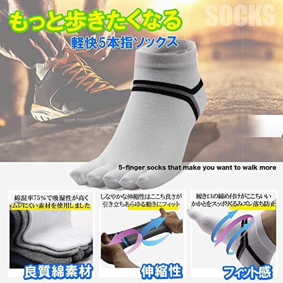 ・もっと歩きたくなる軽快 5本指ソックス 【良質綿素材】綿混率75%で吸湿性が高くムレにくい素材を使用しました。 【伸縮性】しなやかな伸縮性がここち良さが引き立ちあらゆる動きにフィット 【フィット感】履き口が締め付けがここちいい。かかとをスッポリくるみズレ落ち防止