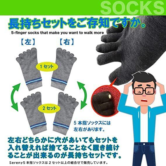 ・【長持ちセットとは】先丸ソックスなどと違って、五本指ソックスには左右が存在します。左右のどちらか破れてしまうと捨てるしかなくなります。そこで、Sereny五本指ソックスは左右2足以上のセット組で販売しています。どちらかが古くなって破れしまった場合でも代替えが効くように複数枚でセット組されています。
